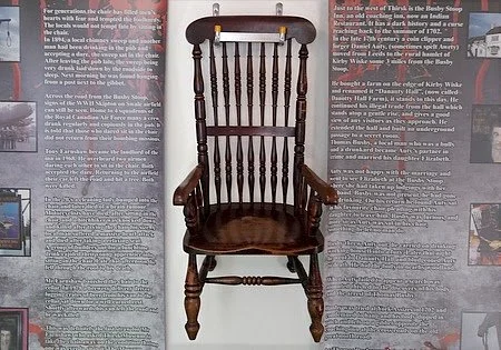 We open on an argument between son-in-law and father-in-law (alcohol was probably a factor, well that and the undeniable fact that his son-in-law was most likely a loser). Tempers flare and things get heated. The next morning Father-in-law is found bludgeoned to death in the woods near his home. Busby aka son-in-law is charged with his murder, found guilty and sentenced to hang to death. He was granted a final pint at his favorite pub which conveniently sported a gallows right out back. Perhaps a selling point for some. Busby was such a regular that he even had his designated chair that he always sat in so of course that is where he rested his bottom to have his last pint. Apparently incensed during this last pint Busby placed a curse on the chair stating that anyone who sat in it would be killed. Our author includes a few stories of individuals that had the bad luck to sit in that chair and meet an untimely demise. Finally after several deaths the light bulb finally went off in the mind of the pub owner and he place the chair down in the basement in storage. Unfortunately after several years without incident folks that were working for or around the pub found the chair and would use it to rest in. More untimely death started to occur. Eventually the Mensa member pub owner decided to donate the chair to the Thirsk Museum which is where it hangs now. And I mean hangs, like on the wall. This way no one can sit in it. You know, just in case.