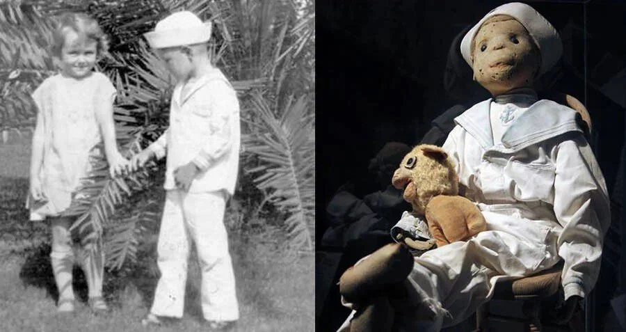 Left: A young Robert Eugene Otto (right) wearing the sailor’s suit that was eventually given to Robert the Doll.